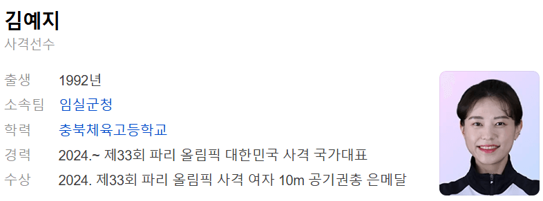 충북 단양 출신으로 1992년에 태어나서 올해 31세인 김예지 선수는 임실군청 소속입니다. 단양중학교와 충북체육고등학교를 졸업하였고, 가족 관계로는 배우자와 올해 6살인 예쁜 딸이 있습니다.