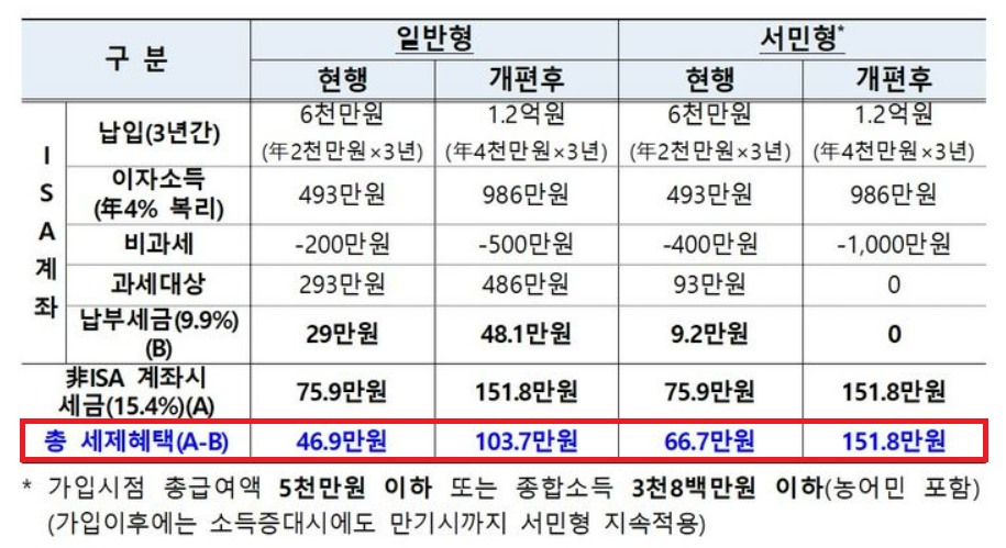 개편 전, 일반형의 경우 3년간 총 6,000만 원을 납입해 얻을 수 있는 이자소득이 493만 원으로 비과세에 해당하는 200만 원을 제하고 초과되는 293만 원에 9.9%의 분리과세가 적용되어 최종적으로 29만 원의 세금을 납부하게 되는데, 이를 일반 계좌로 계산하면 75만 9000원의 세금을 냈어야 하므로 46만 9000을 절약하게 됩니다.